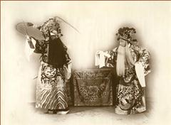 《闹朝扑犬》翁偶虹饰屠岸贾(左),说书红饰赵盾(右)