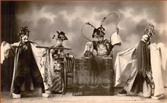 《匕首剑》翁偶虹饰秦舞阳(右),张玉玺饰荆轲(左),吴幻荪饰秦王(右二),景孤血饰赵高(左二)